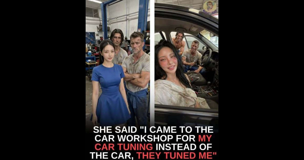 A stunning brunette walked into a gritty auto shop expecting a simple engine tune-up and oil change… but what she got instead was a full-service “experience” that left her posting the most dramatic confession on TikTok. In a playful selfie series filmed right in the workshop, she’s seen posing in front of two muscular mechanics — one with long dark hair and intense eyes, the other rugged and covered in grease — both looking like they stepped straight out of a calendar shoot.